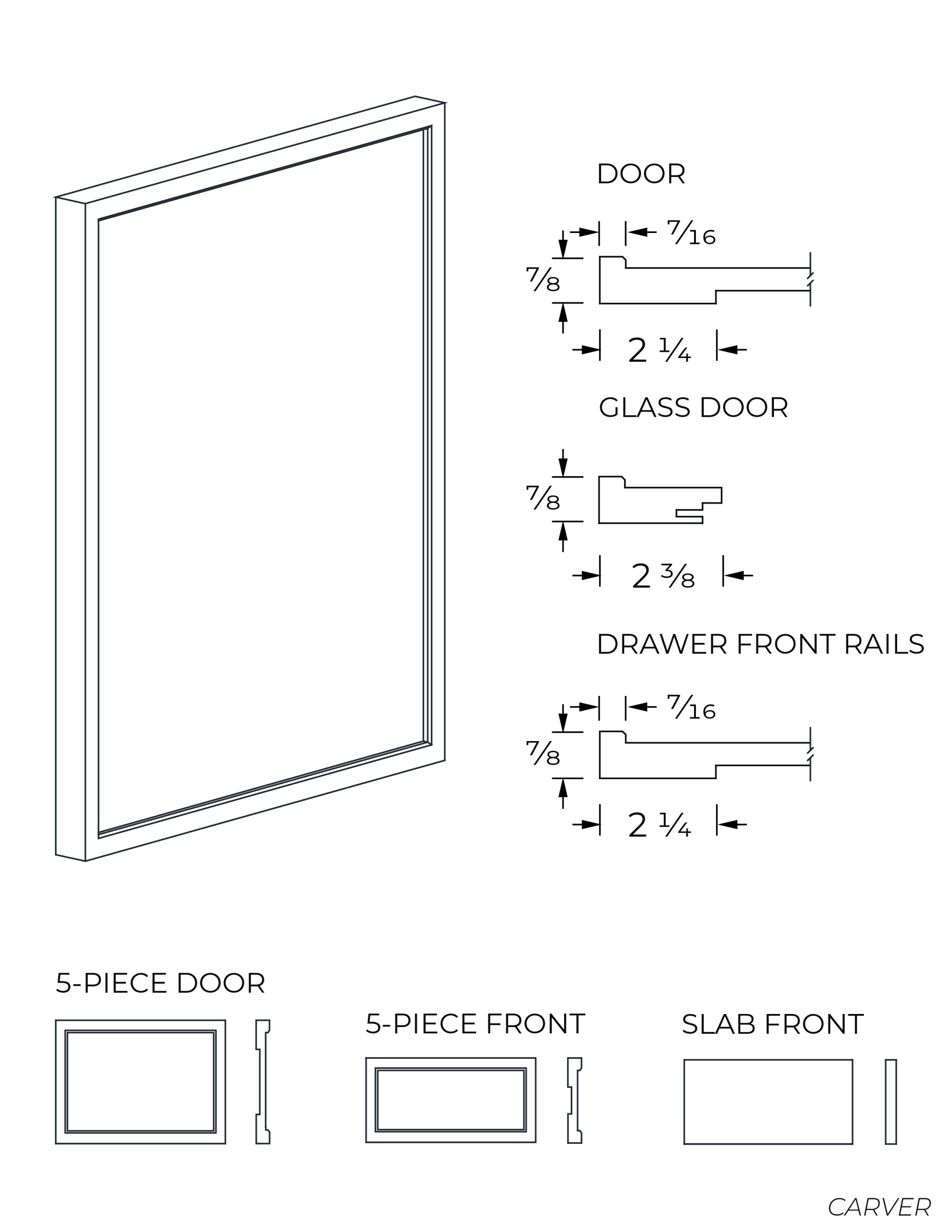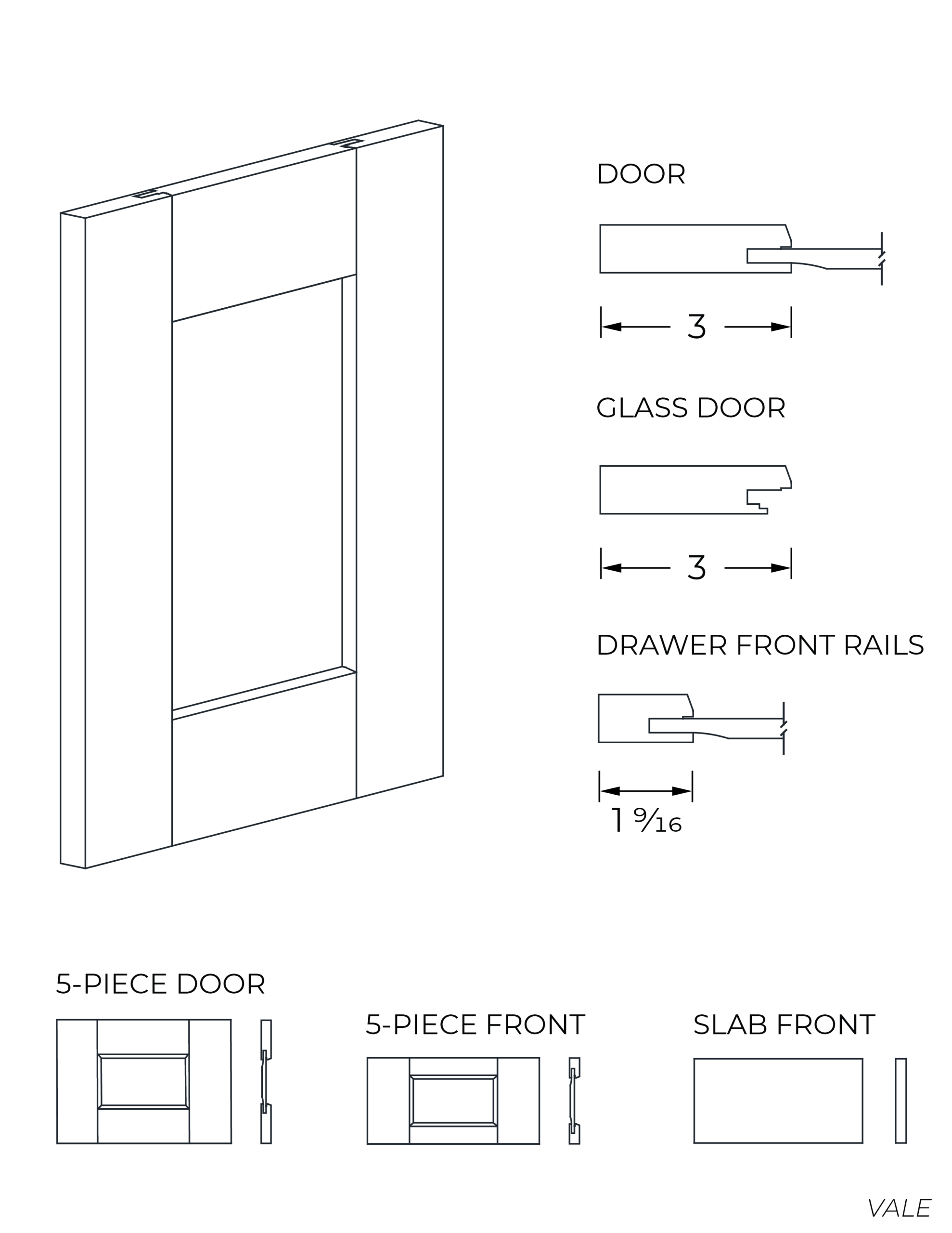 The full overlay doors and drawer fronts cover the entire cabinet opening, leaving a 1/16″ gap between the door and the cabinet’s side and a 1/8″ gap between doors and drawer fronts.